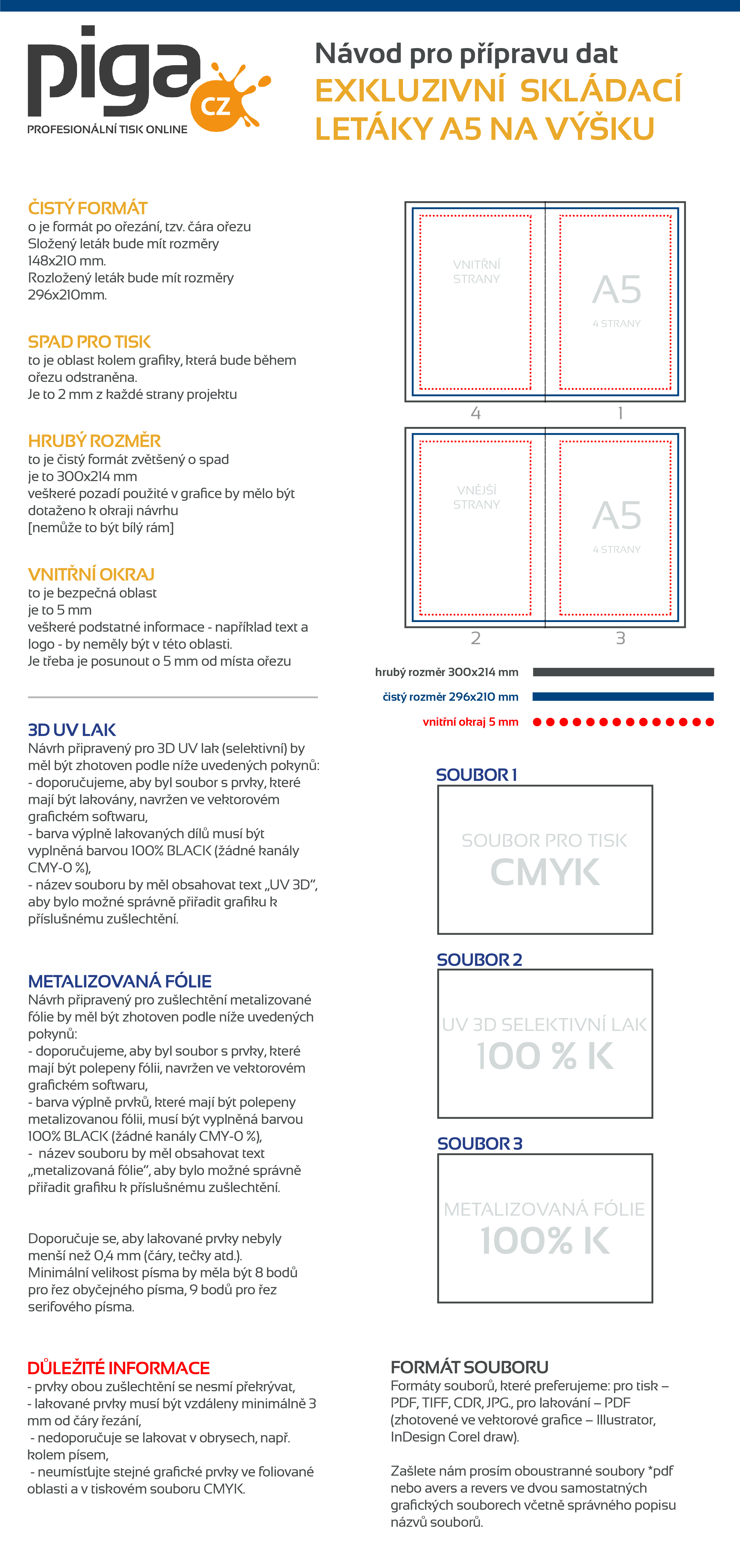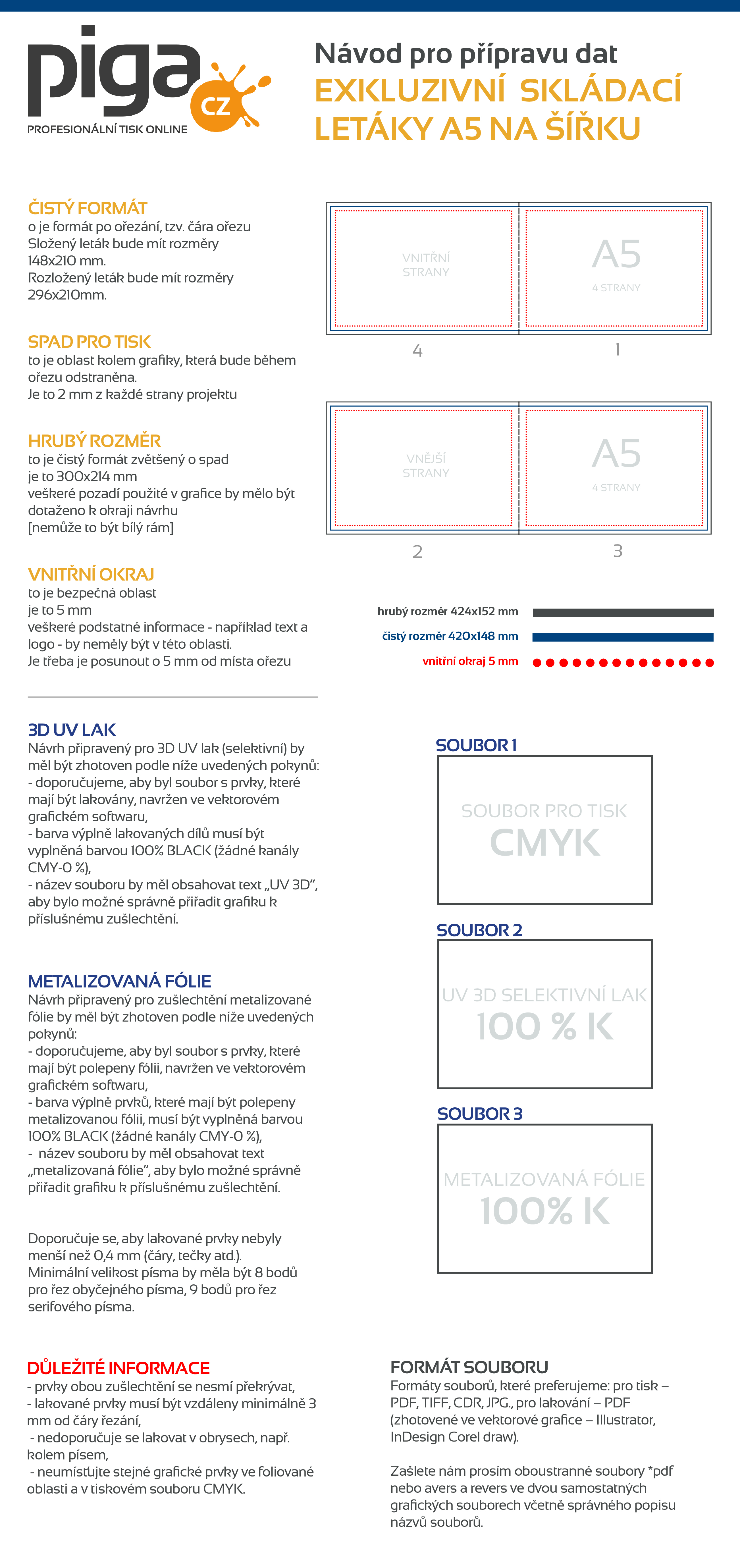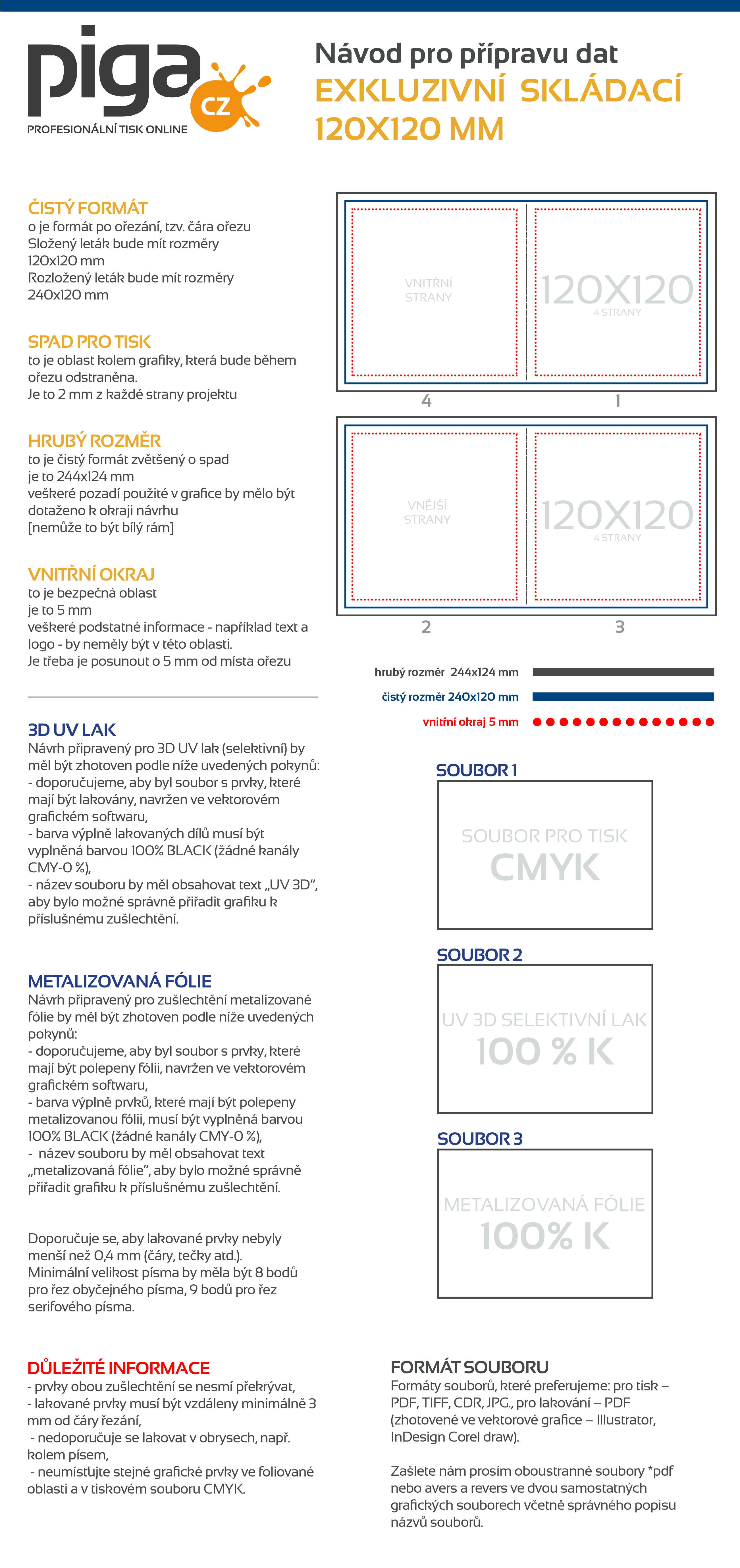 Skládací exkluzivní letáky jsou naším novým efektivním a jednoduchým způsobem, jak propagovat vaši firmu. Pomocí exkluzivních skládacích letáků můžete předat vaším zákazníkům v úhledné, čitelné a atraktivní podobě spoustu užitečných informací. I když se to nezdá, letáky nekončí okamžitě v odpadkovém koši. Jedná se stále o jednu z nejúčinnějších metod propagace podnikání. Správně připravený grafický návrh již na první pohled zaujme a přesvědčí potenciální zákazníky. Naše exkluzivní skládací letáky pomohou vaší firmě vyniknout nad konkurencí a získat pozornost. Použití konvexního laku, zlacení, stříbření a dalších metalizovaných fólií známých jako zušlechtění vám pomůže vyhrát boj o čas a pozornost potenciálního zákazníka. Zušlechtění také způsobí, že se příjemce bude cítit výjimečně, když se mu do rukou dostane stylově a úhledně připravený leták.