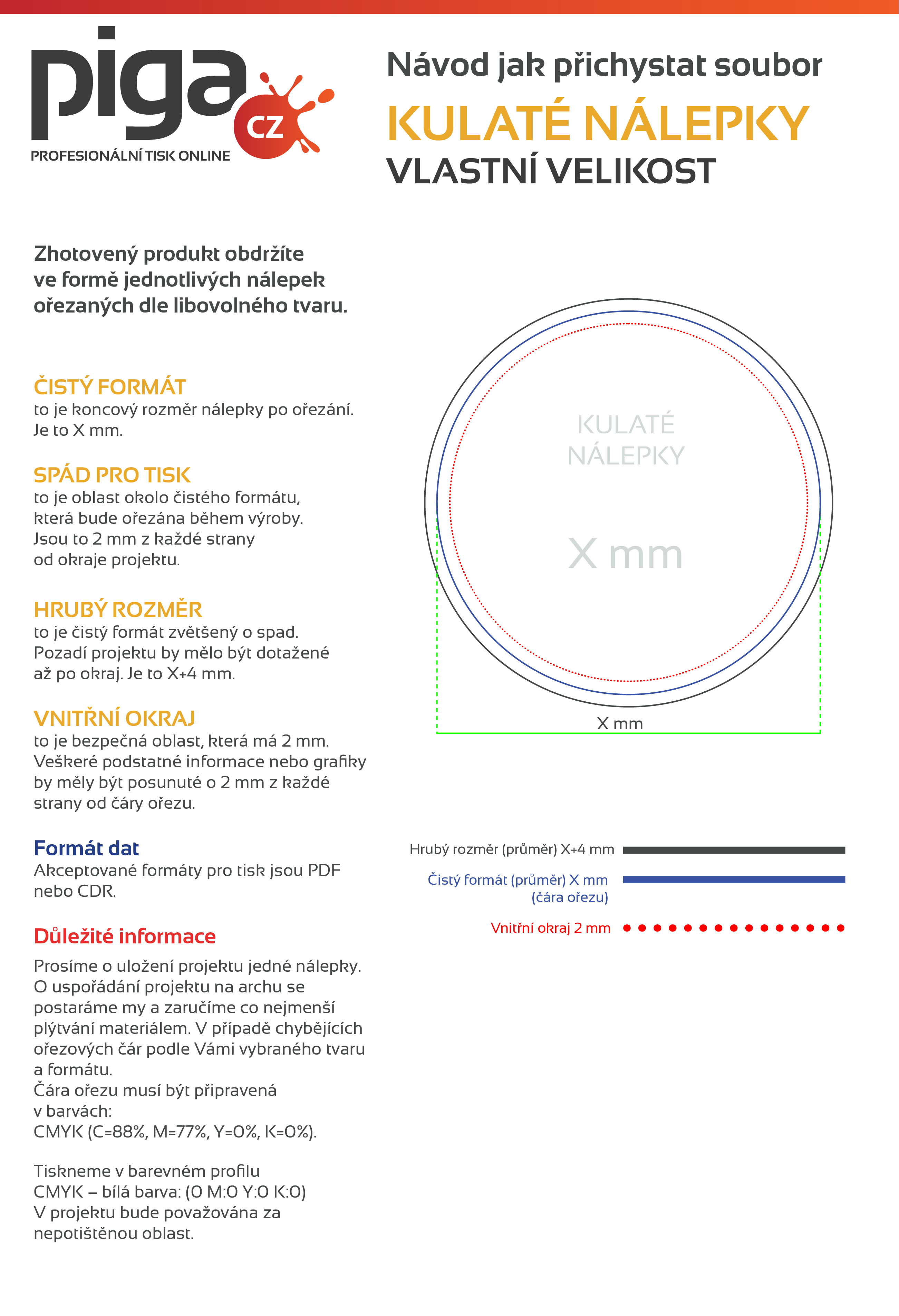Naše preferované formáty souborů jsou PDF, TIFF a JPEG. Poskytujeme pokyny, jak připravit soubor a šablony / makety pro jednotlivé grafické programy, jejich uložením na disk získáte dimenzovanou pracovní plochu, kde můžete navrhnout svou grafiku. Klikněte na ikonu a stáhněte soubor.