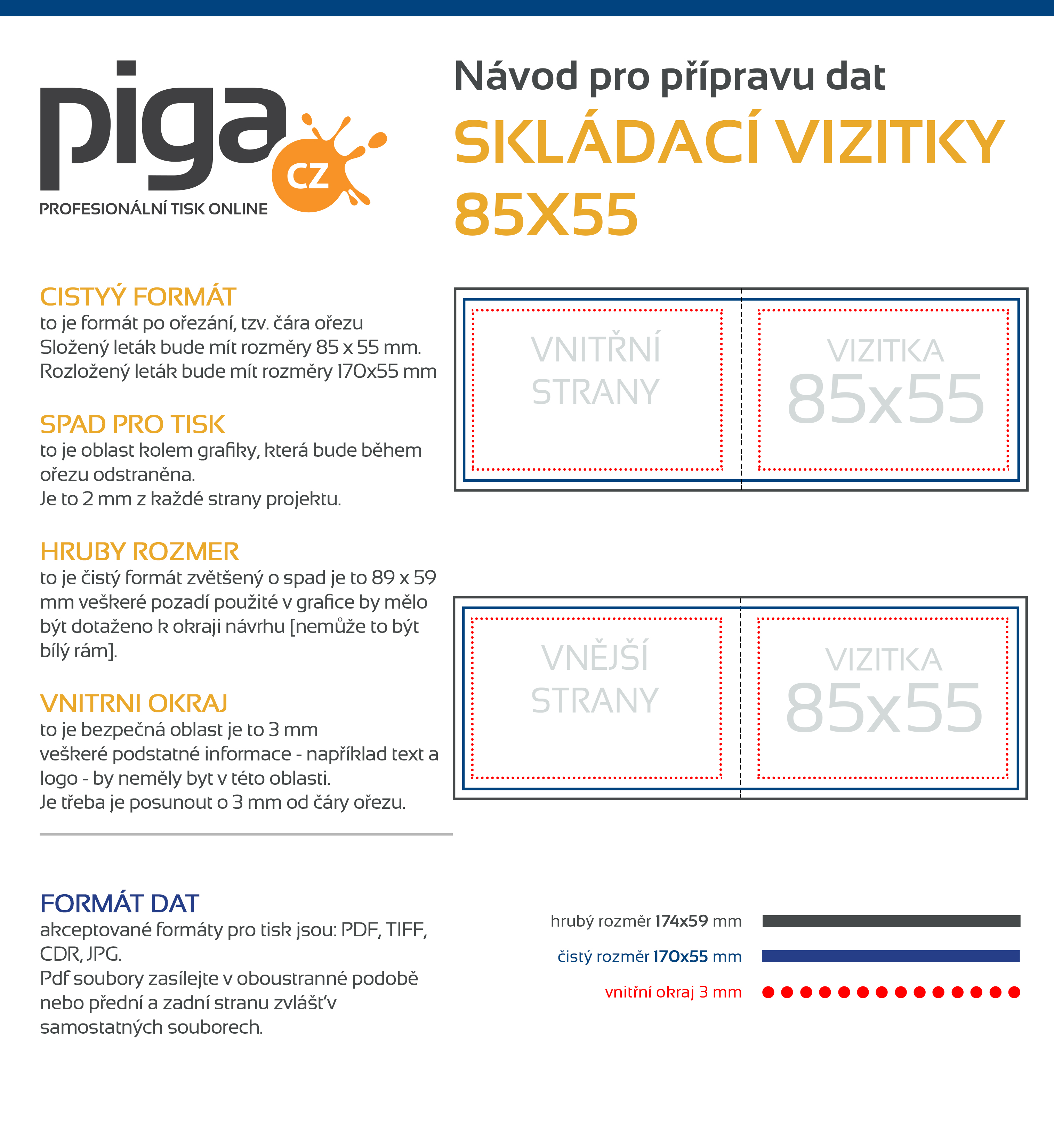 Ve skládacích vizitkách necháváme volný prostor pro poznámky. Piga.cz nabízí dva formáty, kterých rozměry po složení jsou 85x55 mm nebo 90x50 mm. Abychom maximálně urychlili proces objednávání a zlepšili obsluhu našich zákazníků, vytvořili jsme online objednávkový systém, který je dostupný na našich webových stránkách Piga.cz. Objednávky lze zadávat sedm dní v týdnu, 24 hodin denně. Systém umožňuje samostatný výběr parametů a nákladu vizitky. Dostupné paramatery: formát (85x55 mm nebo 90x50 mm), barvy (jednostranný nebo oboustranný potisk), zušlechtění (lesklá fólie, matná fólie, fólie soft touch), tvar rohů (obdelníkové nebo zakulacené), papír (matná křída). Realizujeme objednávky na nízký počet kusů (od 100 kusů) a také na vysoké počty kusů (5 tisíc kusů a více). Můžete zasílat vlastní, hotové grafické návrhy vizitek. Našim klientům poskytujeme pomocné šablony, díky kterým si můžete vytvořit vlastní projekt. Šablony jsou dostupné ve formátech PSD, Ai, PDF, CDR. Ke každé šabloně připojujeme návod v JPG pro přípravu souboru. Na žádost zákazníků realizujeme pro Vás projekty skládacích vizitek na základě materiálu a pokynů, které jste nám zaslali.