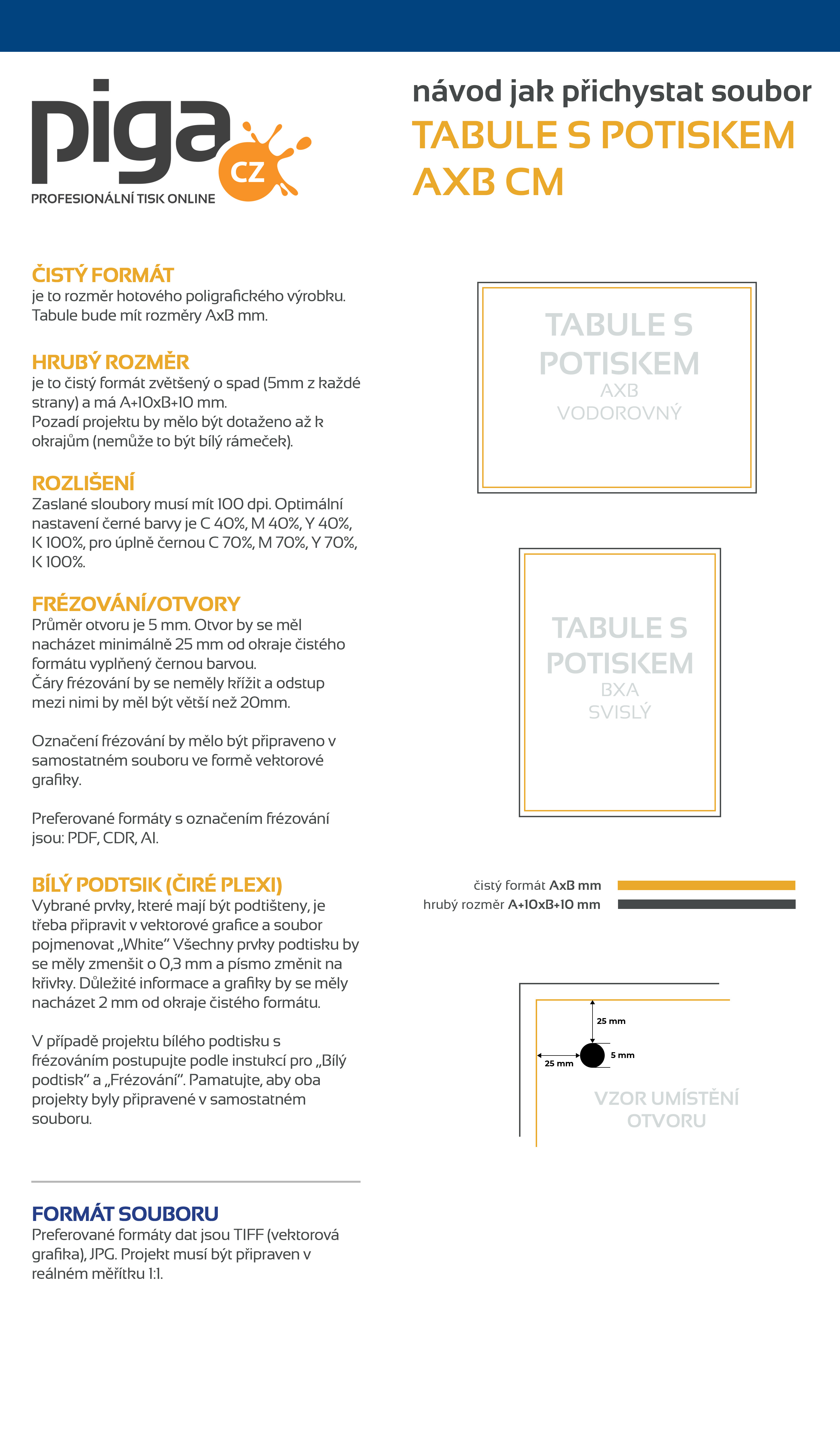 Naše preferované formáty souborů jsou PDF, TIFF a JPEG. Poskytujeme pokyny, jak připravit soubor a šablony / makety pro jednotlivé grafické programy, jejich uložením na disk získáte dimenzovanou pracovní plochu, kde můžete navrhnout svou grafiku. Klikněte na ikonu a stáhněte soubor.